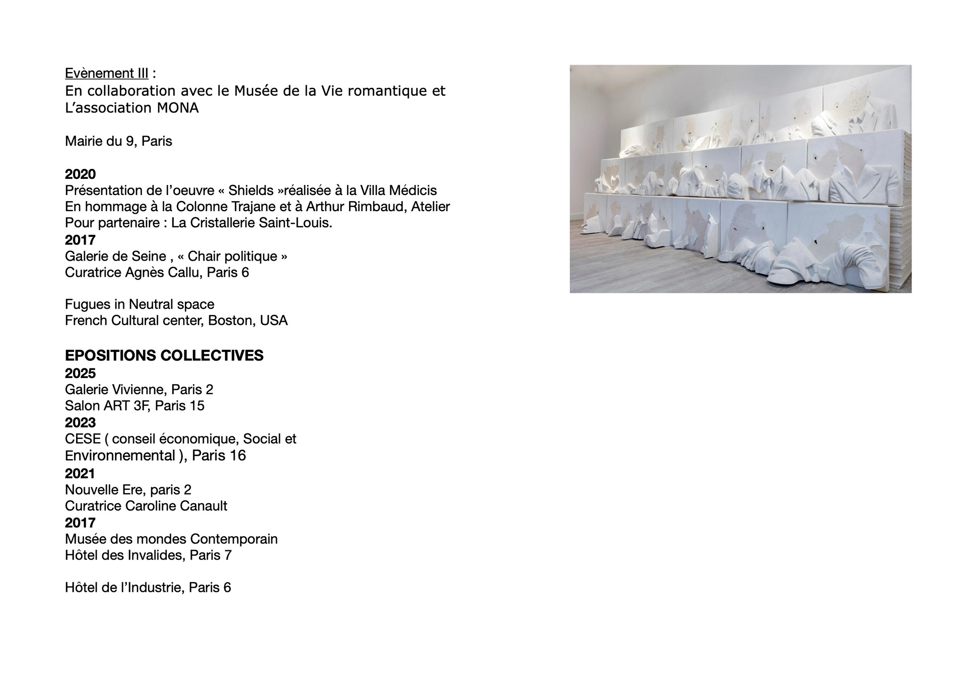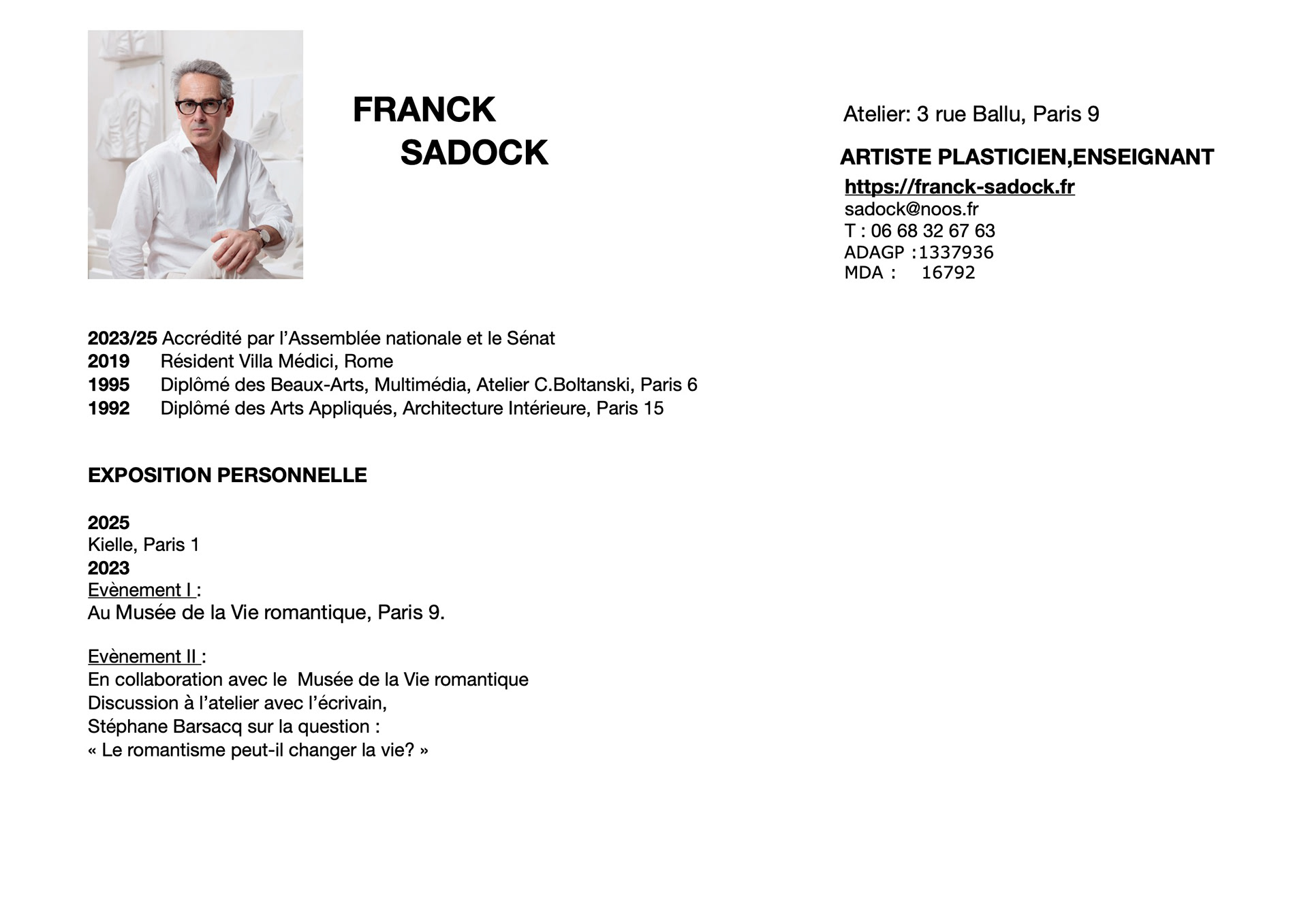 This is the artistic representation of the political image, Parliament interests me in several ways. It is a place reserved for work, for intellectual effort. The energy, so present in the Chamber, is due in particular to the political struggle between the representatives of our institutions and to this "circuit" of sound, language and thought. These activities captured in plaster give rise to serene attitudes of peaceful exchanges».ent highlighting the plasticity of political debate Franck Sadock continues his work, finds a poetry through the sculpted image of a peaceful warrior, a project carried out at Villa Medici in 2019 where he highlights the delicate assembly of crystal and plaster and, through various drawings on paper whose fineness of the line informs us about its sensitivity.