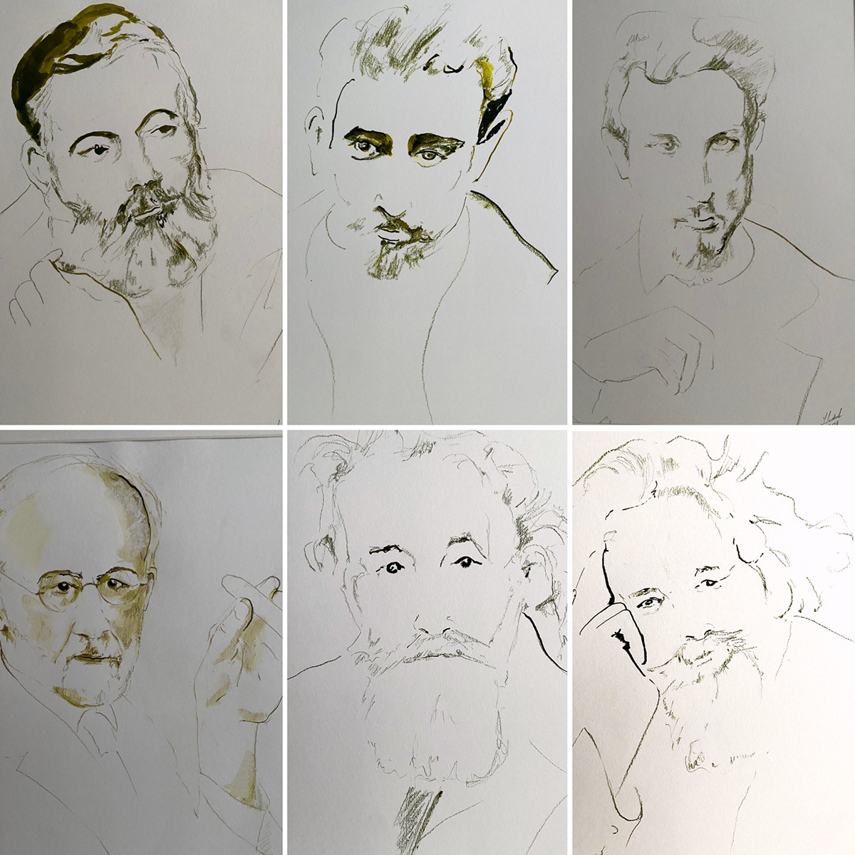 Aquarelle, crayon, encre, sur Canson 30X40cm Colette, Beauvoir, A.F, J.D,Freud, Bacon, Newman, A.B, Casta, Hugo, Hemingway, Rilke, Freud, Bachelard...
