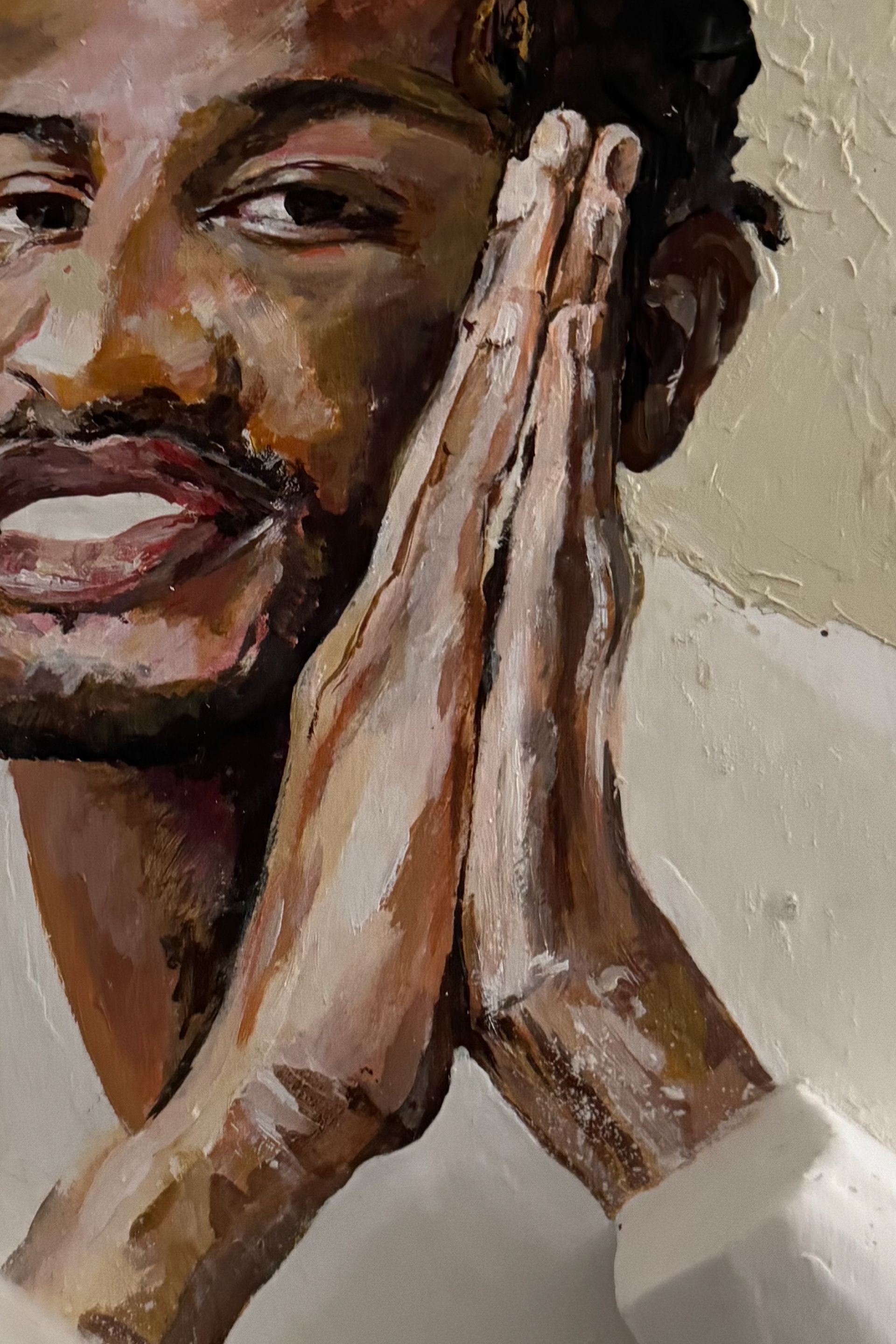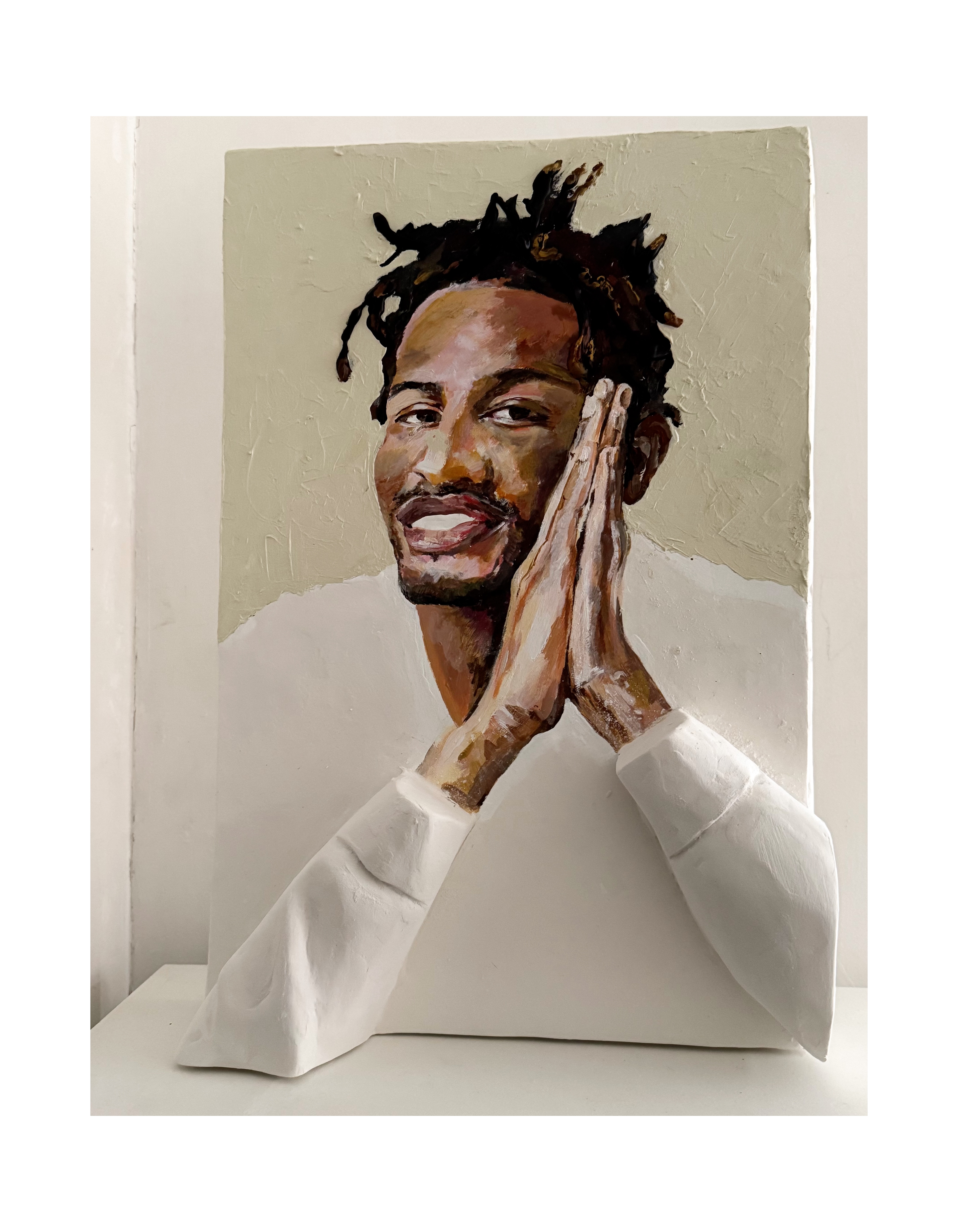 Sculptures, Plâtre, acrylique, 50x33x10 cm, 2025 ou Dessins, encre, 30x40cm Je développe une série consacrée au modèle noir, où les visages et les mains sont peints tandis que les corps sont travaillés en relief. Cette articulation entre peinture et volume crée une présence physique singulière, comme si chaque corps révélait des héritages sensibles : les images héritées, les regards accumulés, les récits silencieux qui habitent encore la chair et que la matière rend perceptibles.